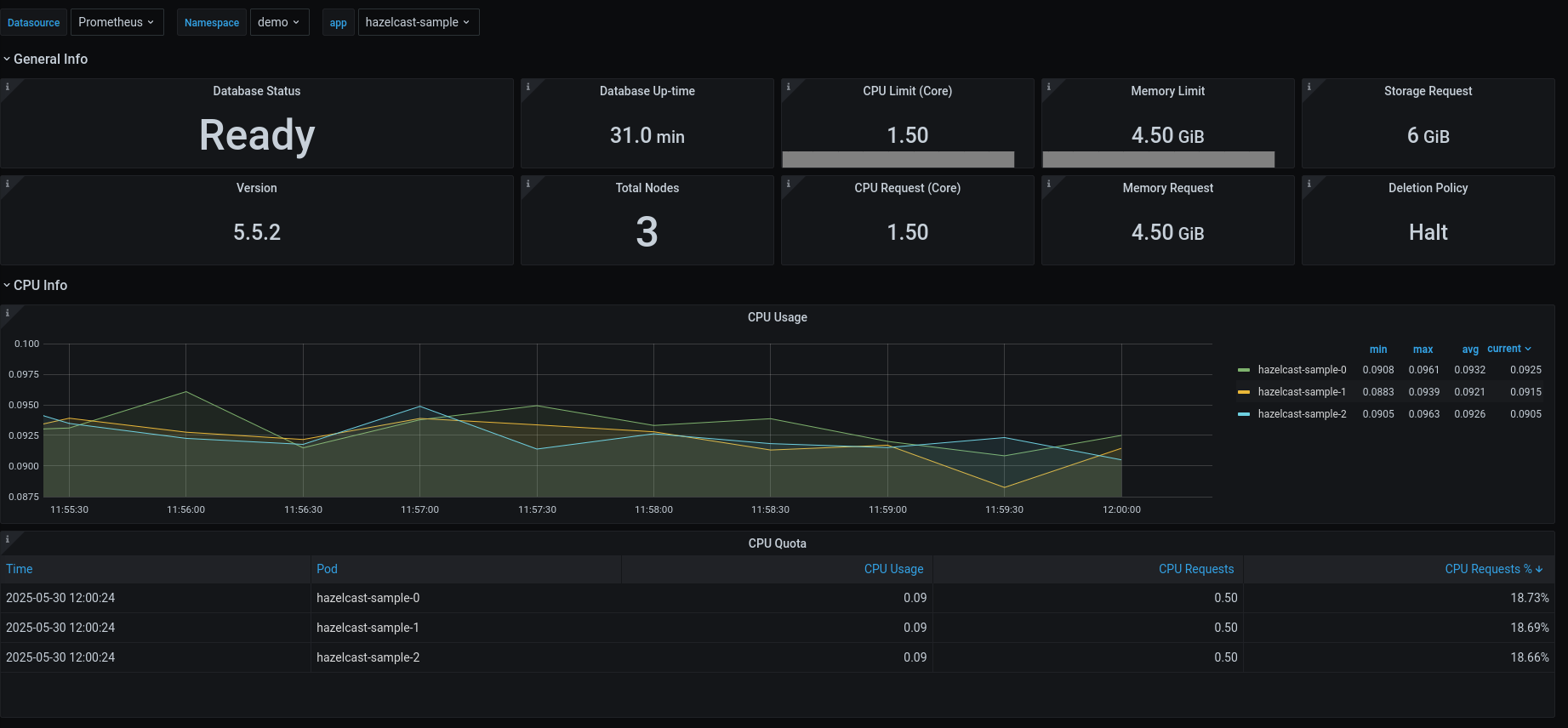 This release introduces an enhanced monitoring feature for KubeDB-managed Hazelcast deployments by integrating Grafana dashboards. These dashboards provide comprehensive insights into various Hazelcast-Specific metrics, statuses, as well as visual representations of memory and CPU consumption. With this dashboard, users can effortlessly assess the overall health and performance of Hazelcast, enabling more informed decision-making and efficient resource management.