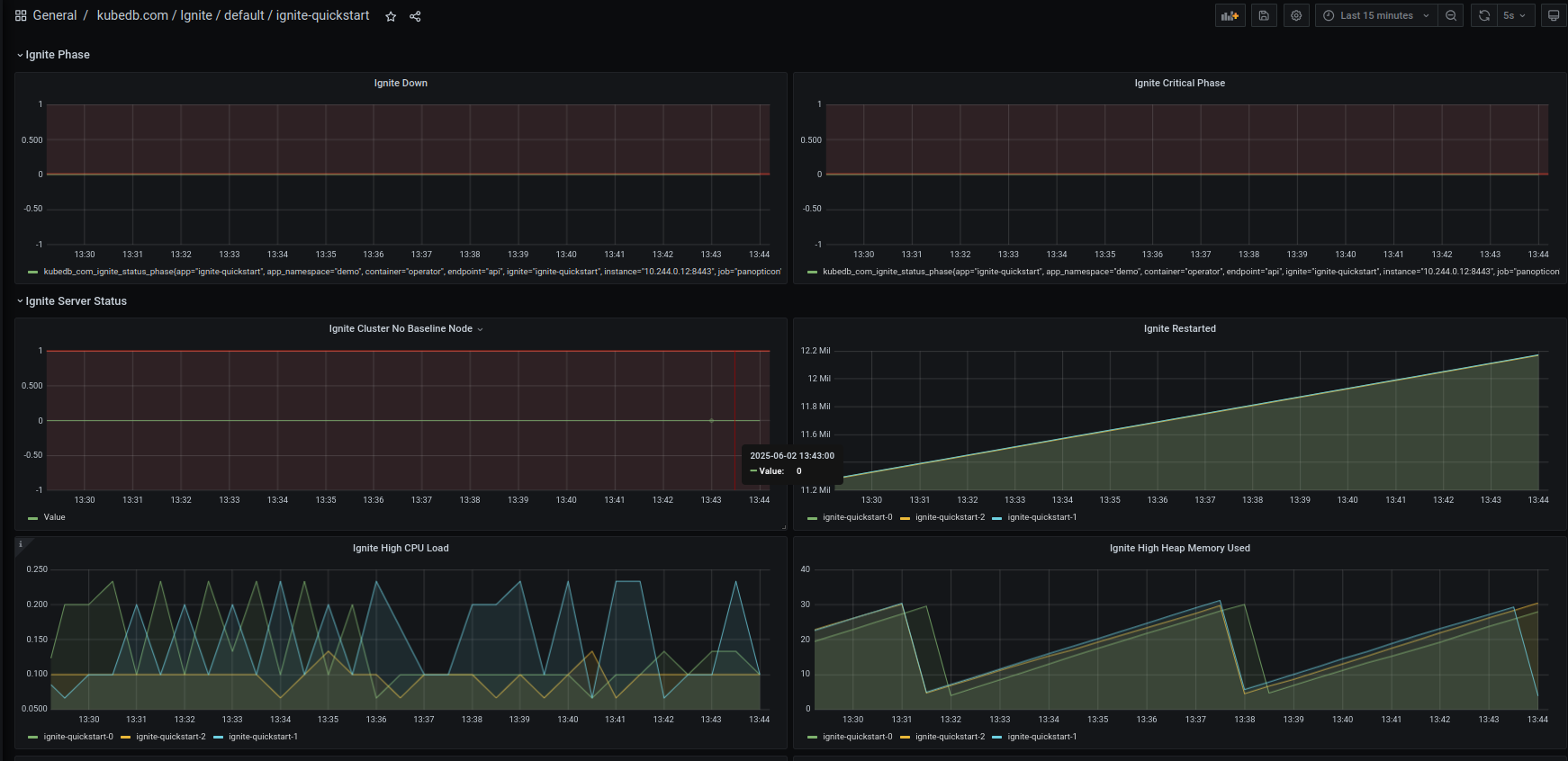 This release introduces an enhanced monitoring feature for KubeDB-managed Ignite deployments by integrating Grafana dashboards. These dashboards provide comprehensive insights into various Ignite-specific metrics, statuses, as well as visual representations of memory and CPU consumption. With this dashboard, users can effortlessly assess the overall health and performance of Ignite, enabling more informed decision-making and efficient resource management. Have a look here for a step-by-step guide to use the monitoring feature in Ignite.